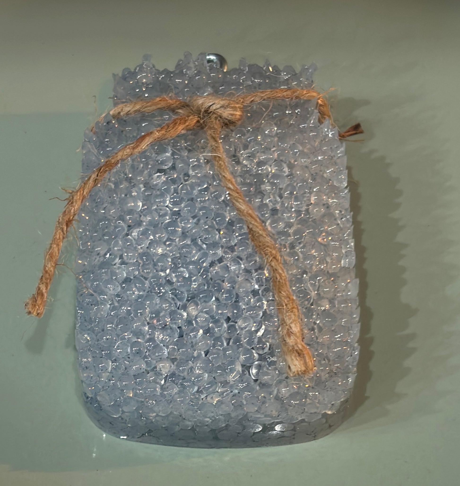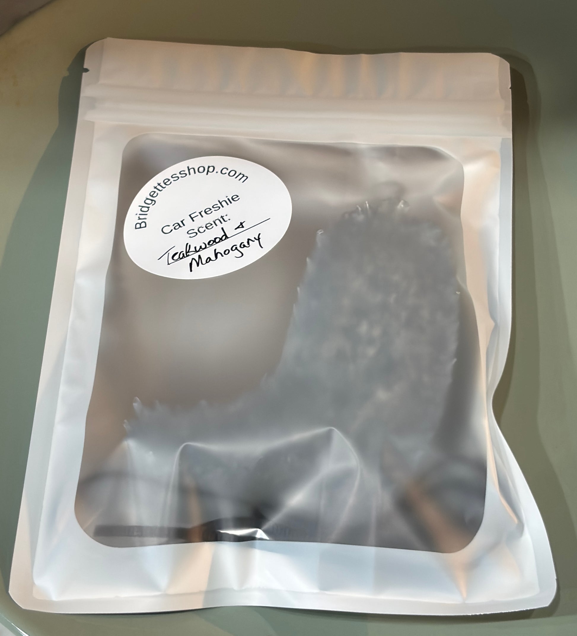 Teakwood & Mahogany scented car freshies, scent is woodsy, but these were colored therefore discounted since Bridgette's Shop won't use color additives, these were my first trial. Smells great, variety of shapes, blueish black in color.