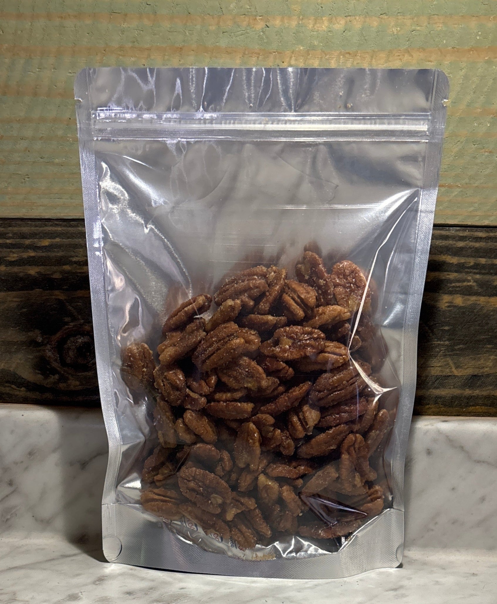 Savor these sugar-free cinnamon brown sugar candied pecans, made with sugar-free cinnamon sugar, a touch of vanilla, sugar-free brown sugar, and whole pecan halves. These delicious, homemade snacks are crafted in small batches and freshly made to order. Choose from 4 oz, 8 oz, 16 oz, or 3-pound options to satisfy your sweet cravings without the sugar.