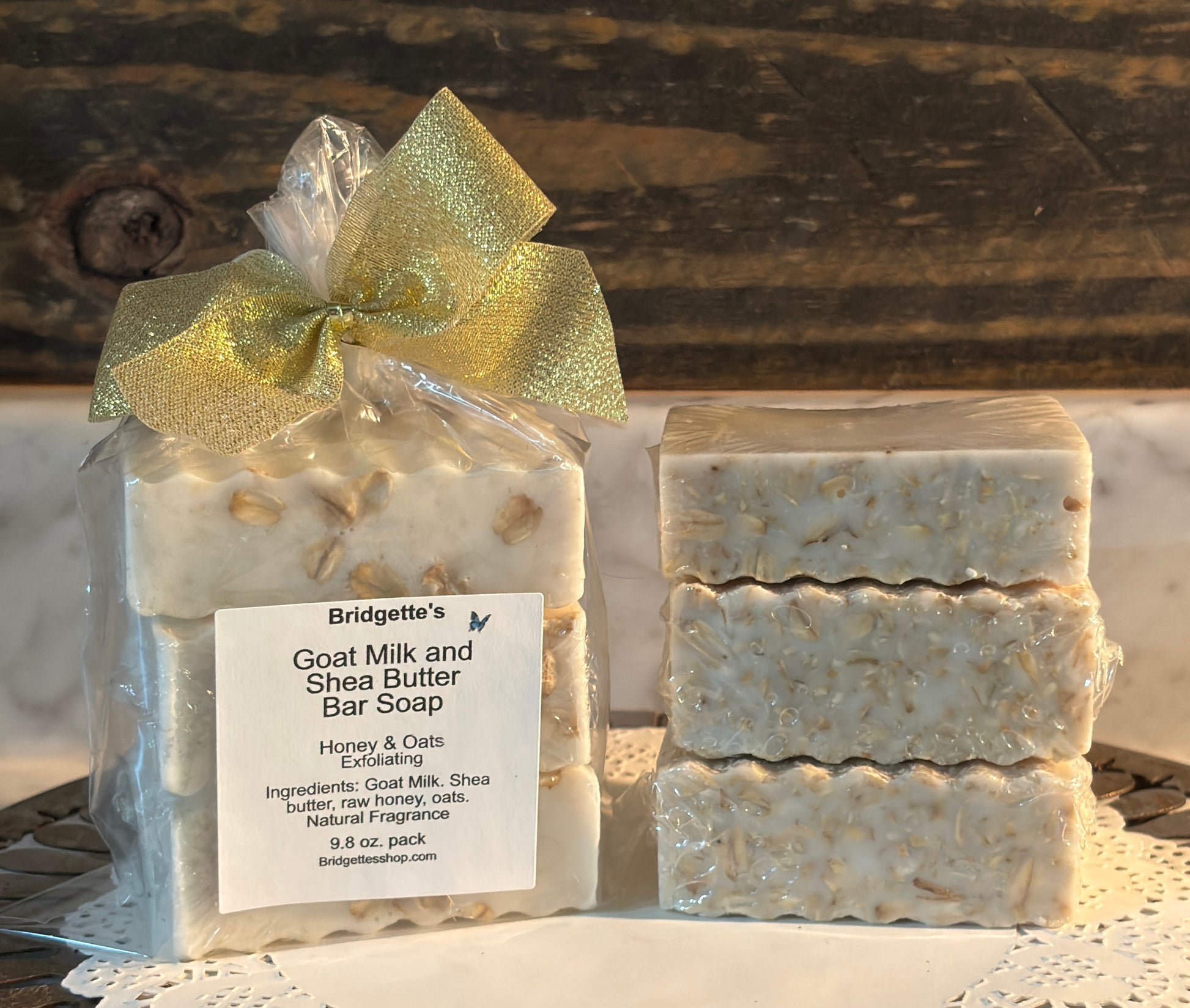 Experience the gentle cleansing power of this Goat Milk and Shea Butter Bar Soap, crafted with a goat milk base and enriched with shea butter, raw honey, and whole oats for effective exfoliation. It contains no added fragrances, allowing the natural aroma of its ingredients to shine through. Each pack includes three bars, each pack weighing around 9.8 ounces and each bar is individually wrapped for your convenience. As always, Bridgette’s Shop uses no additives or colors.