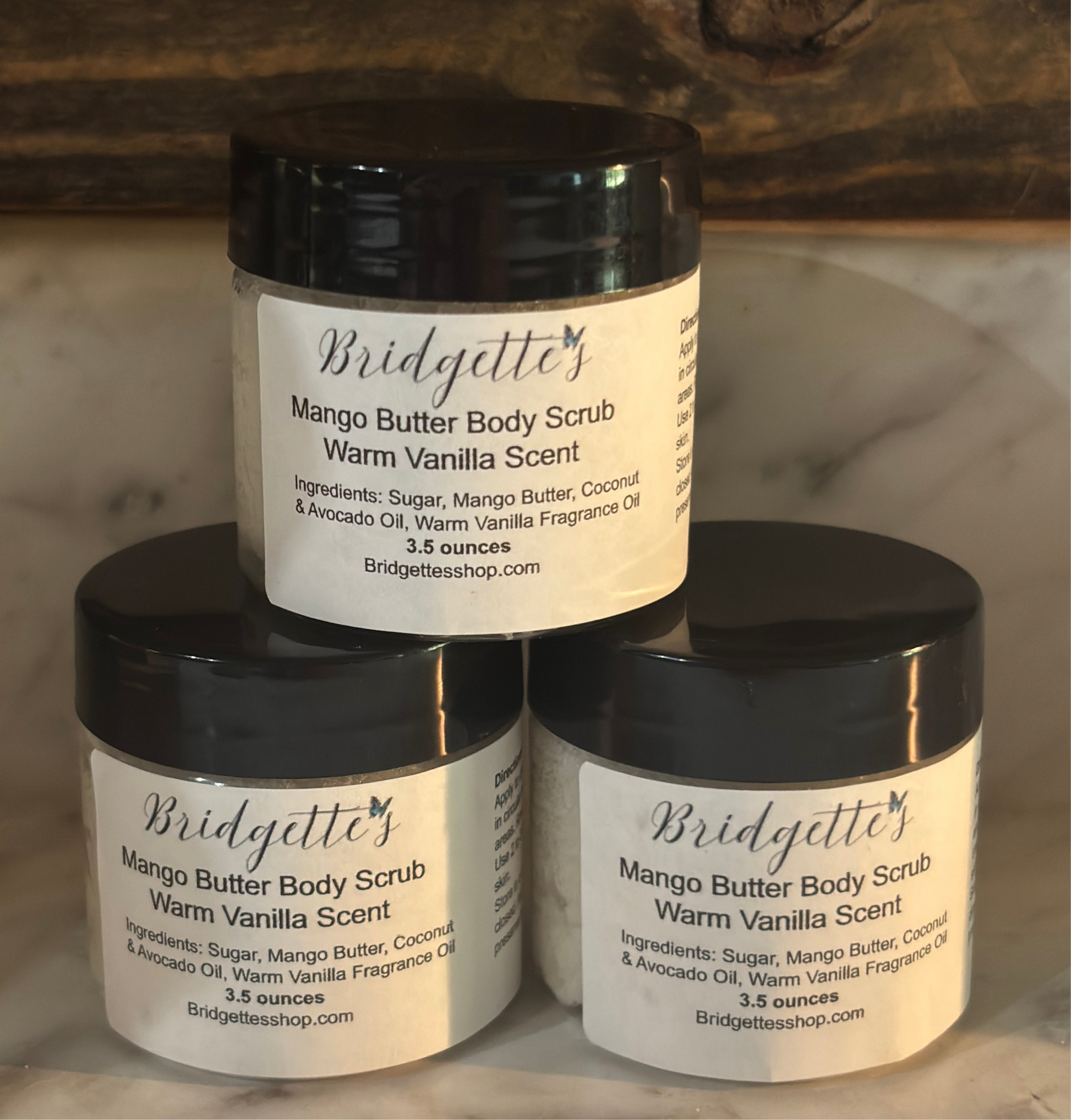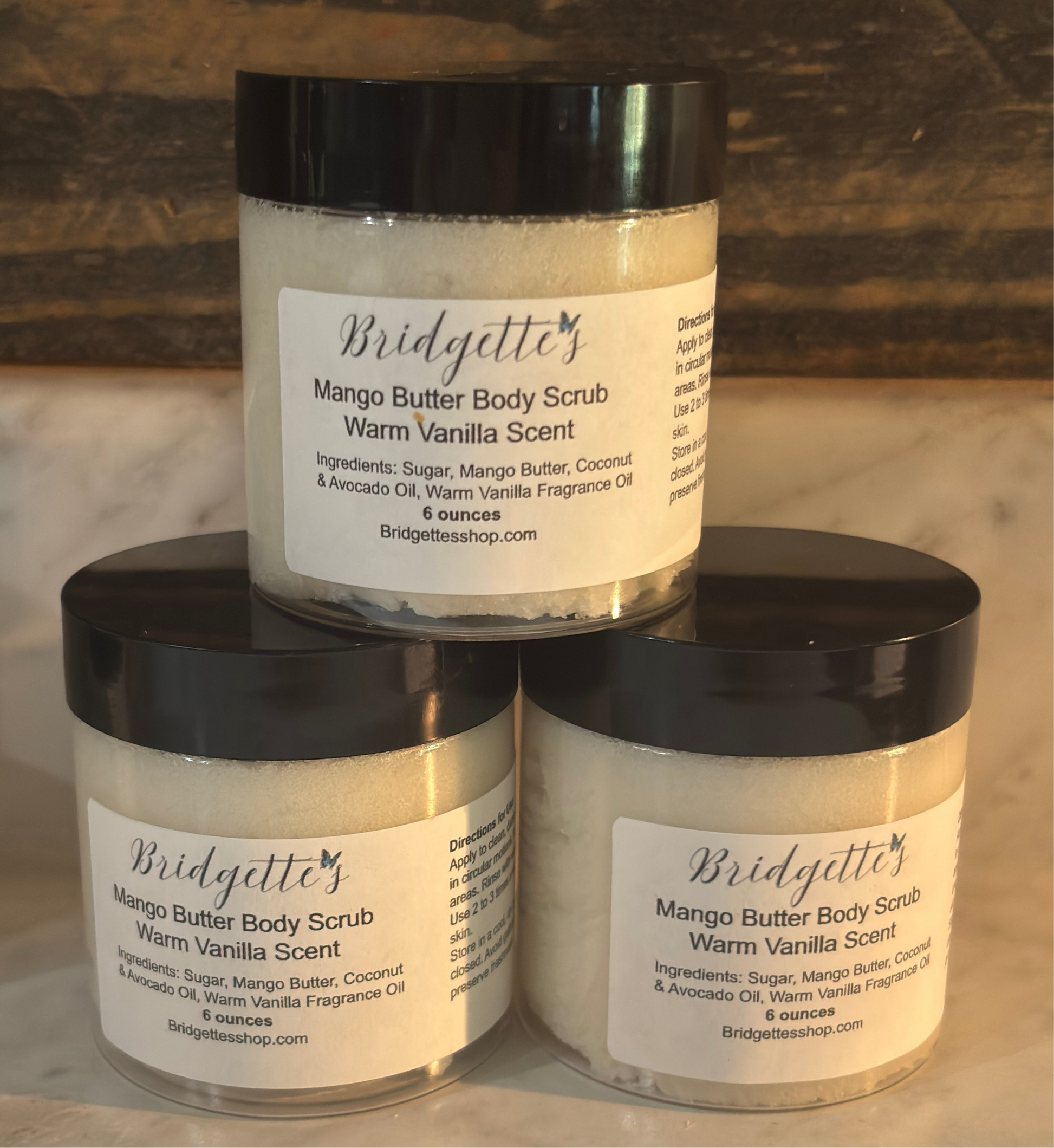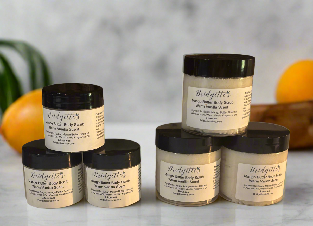Experience the nourishing blend of our Mango Butter Body Scrub, crafted with sugar, mango butter, coconut, and avocado oils. Infused with a cozy warm vanilla scent, this scrub gently exfoliates and hydrates your skin. Available in convenient 3.5 oz and 6 oz sizes, or multi pack, it’s perfect for a luxurious self-care routine.