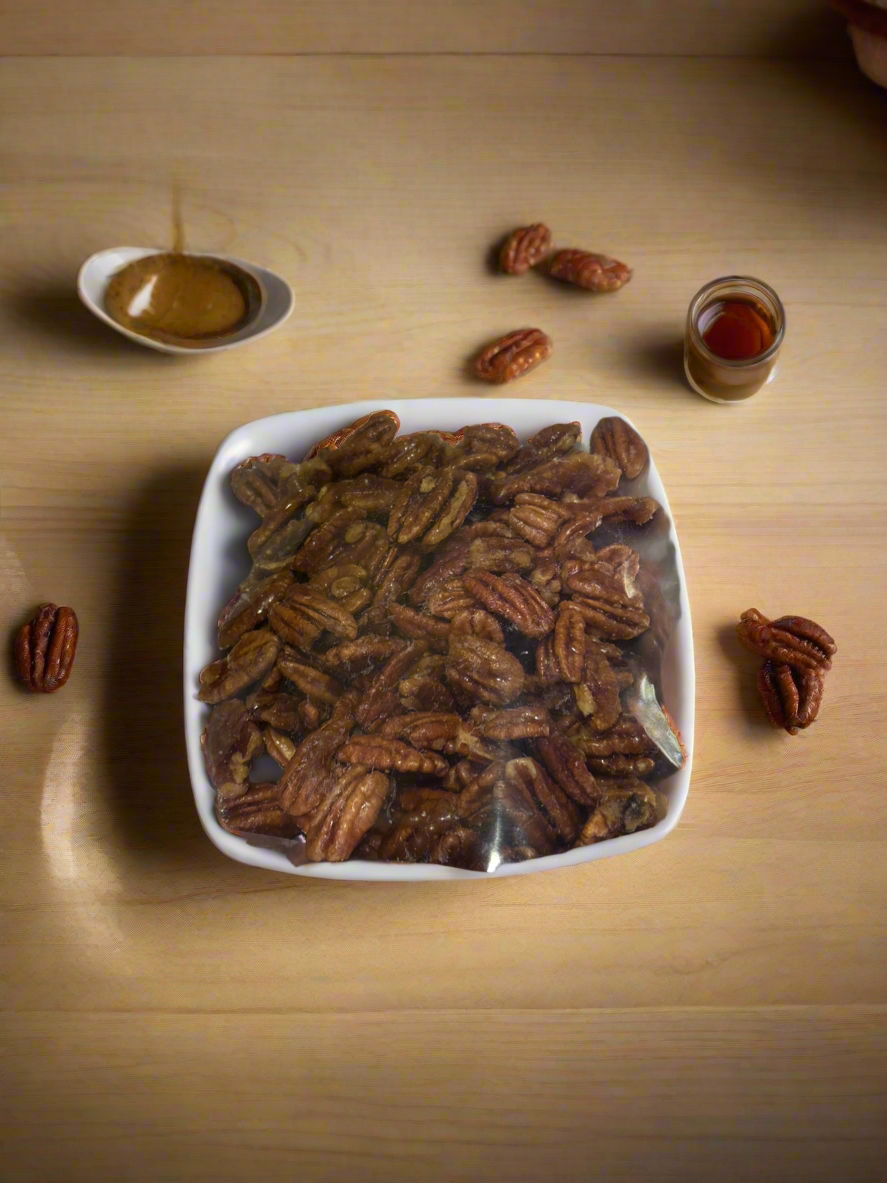 Savor the rich flavor of our stove top maple and brown sugar candied pecans, coated in a decadent sugar-free brown sugar and maple glaze. Made with sugar-free brown sugar, maple, vanilla extract, and a touch of sea salt, each batch is carefully crafted fresh to order. Offered in 4-ounce, ½ pound, 1-pound, and a new 3-pound size, these candied pecans suit every snacking need. Stove top preparation gives them a tender texture, softer than oven-baked varieties.