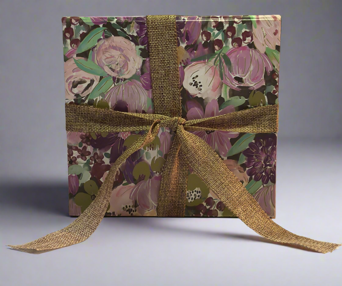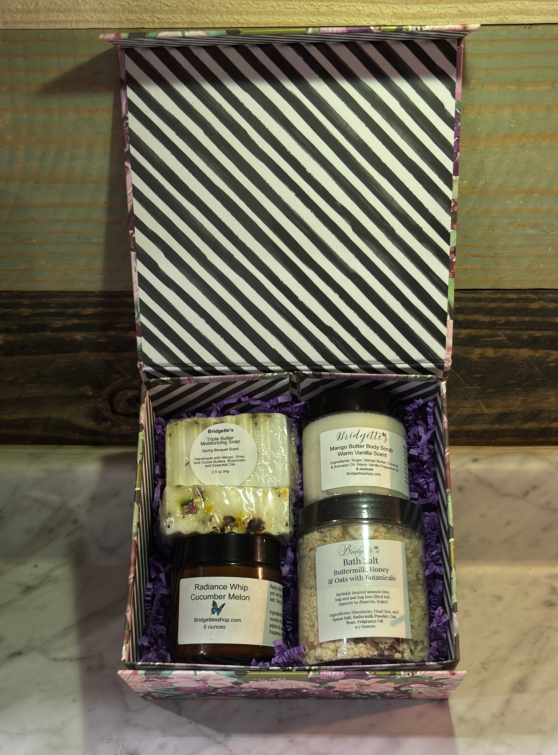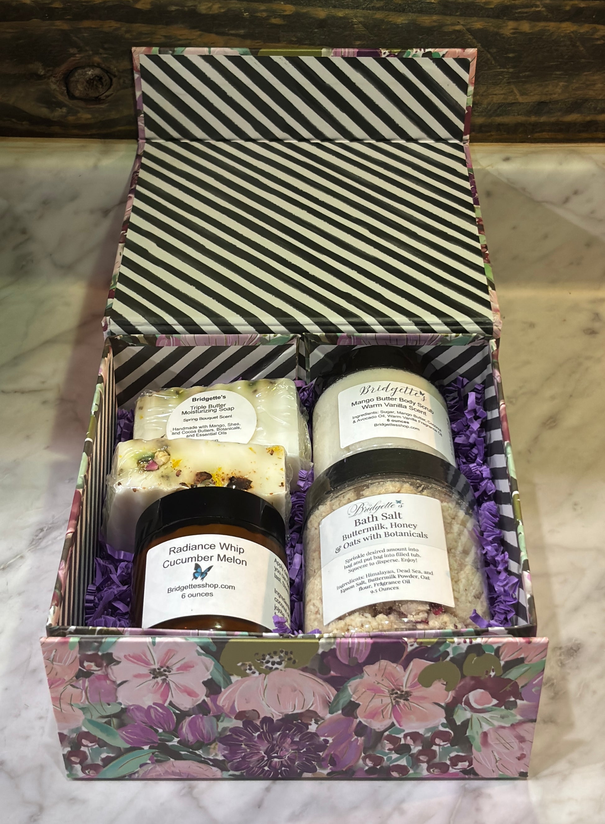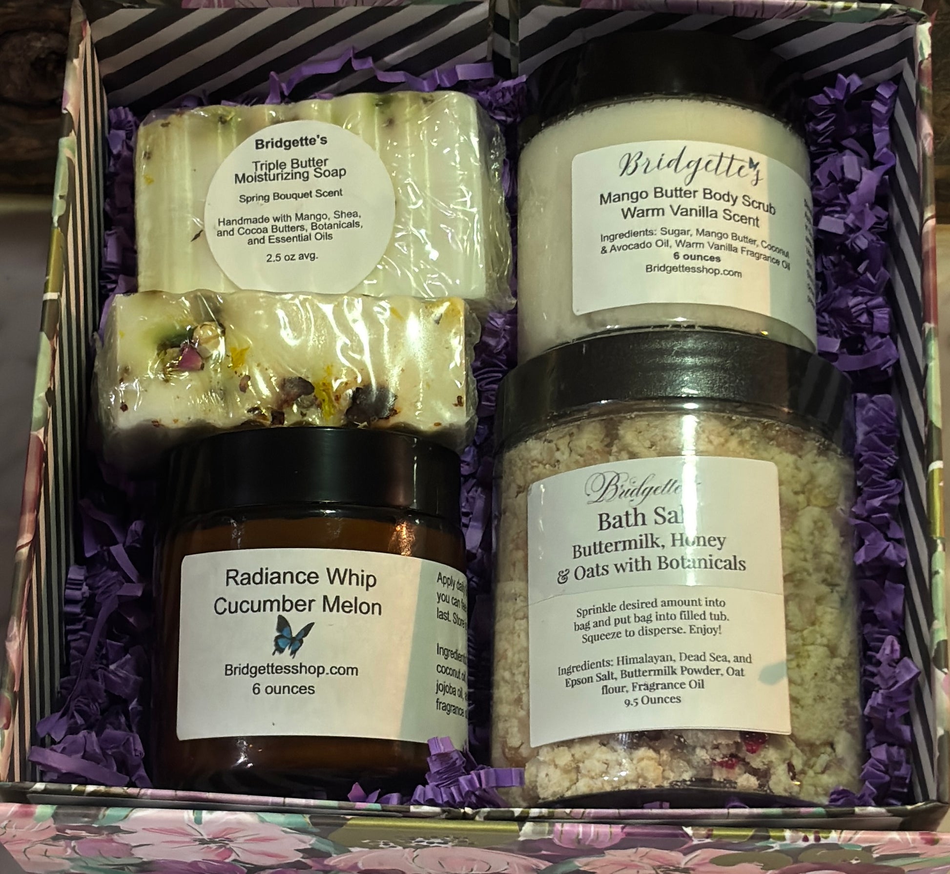 This elegant purple flower box includes two medium Triple Butter soaps, a 9.5-ounce Buttermilk, Honey & Oats Bath Salt with botanicals, a 6-ounce Mango Butter Body Sugar Scrub scented with a warm vanilla scent, and a 6-ounce amber jar of Radiance Whip Cucumber Melon, enriched with shea and mango butter for deep hydration. Perfect as a thoughtful gift or a luxurious treat for yourself—indulge in the ultimate pampering experience.